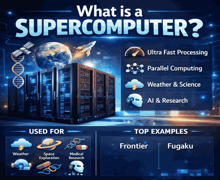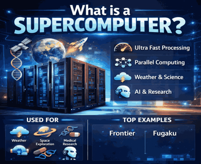 A Supercomputer is an extremely powerful computer that can process vast amounts of data at incredibly high speeds. Unlike regular computers, which perform tasks one at a time, Supercomputers can handle millions or even billions of calculations simultaneously.